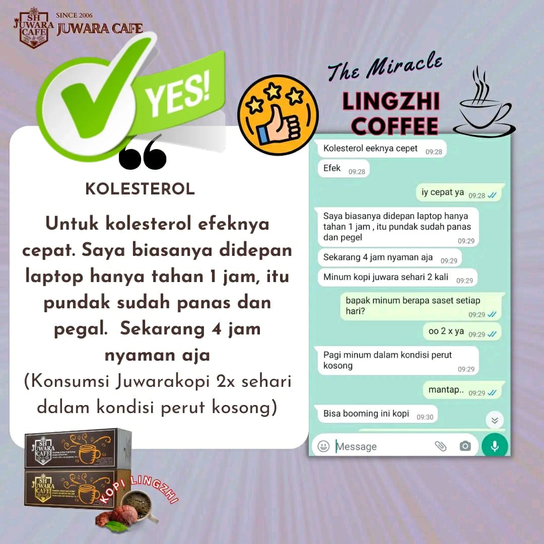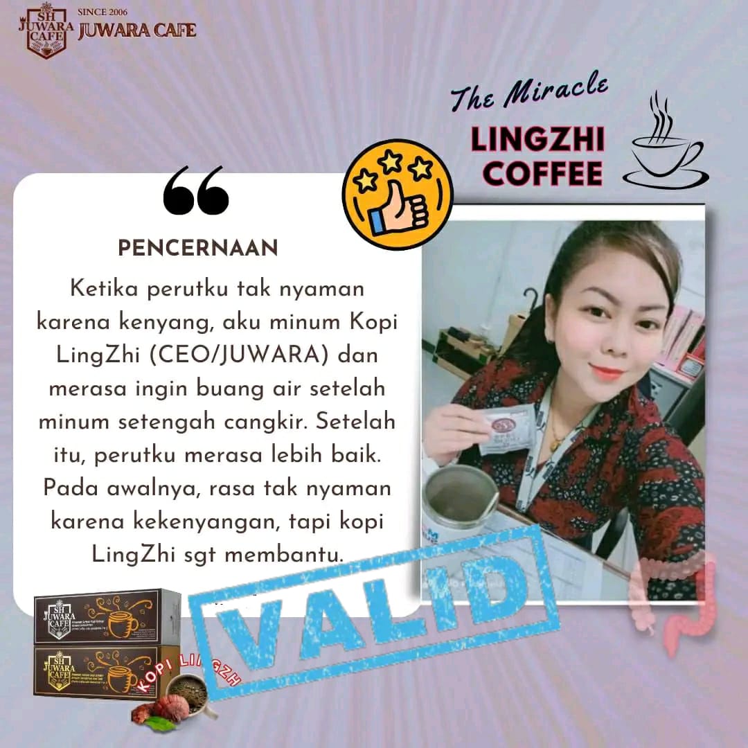Formulasi Selama 4 Tahun:Proses formulasi selama 4 tahun menegaskan kehati-hatian dalam menggabungkan kopi dengan LingZhi, menunjukkan komitmen terhadap pengembangan produk yang optimal.Mengandung Yungkien LingZhi dari Taiwan: JUWARA Kopi merupakan satu-satunya jenis kopi yang mengandung Yungkien LingZhi dari Taiwan. Ini memberikan nilai terapi yang berpotensi membantu dalam proses penyembuhan berbagai penyakit.Biji Kopi 100% Brazil Arabika & Krimer dari VCO Belanda: Kombinasi biji kopi 100% Arabika dari Brazil dan krimer dari VCO Belanda memberikan citarasa yang lembut dan nikmat sekali. Selain itu, JUWARA Kopi juga bebas dari lemak trans, sehingga aman untuk kesehatan jantung.Dengan JUWARA Kopi, Anda mendapatkan manfaat kesehatan, kenikmatan rasa, dan yang tak kalah penting, harga yang terjangkau.