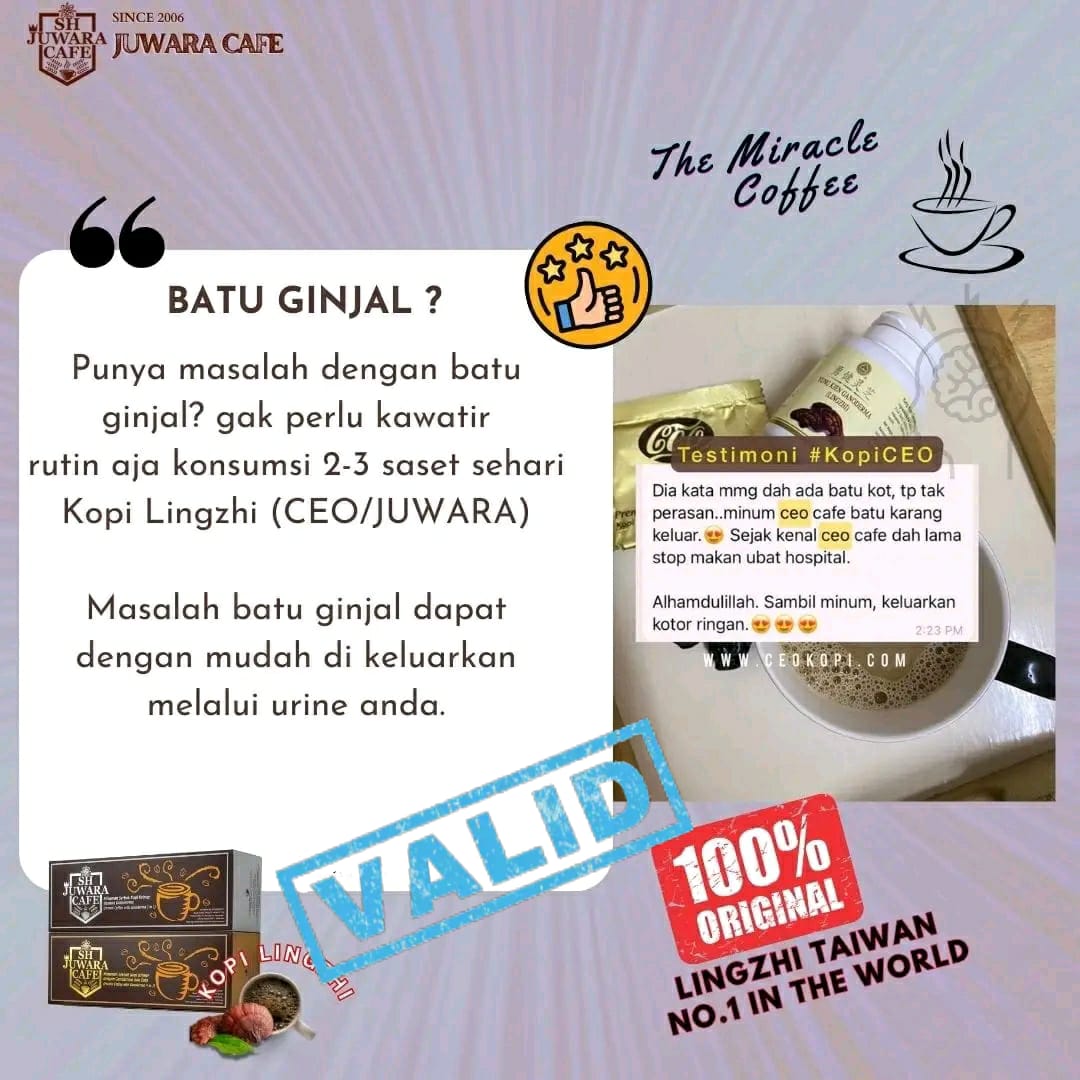 Bukan KOPI Yang dapat merusak ginjal, kerusakan pada ginjal umumnya terkait dengan bahan kimia tambahan yang ada dalam beberapa kopi instan. JUWARA Kopi tidak mengandung bahan kimia tambahan, yang berbeda dengan kopi instan lainnya. Sebaliknya, kandungan LingZhi/Ganoderma dalam JUWARA Kopi TERBUKTI Secara Klinis memiliki manfaat dalam memperbaiki masalah ginjal, seperti membantu menghilangkan batu ginjal dan meningkatkan kelancaran proses buang air kecil.