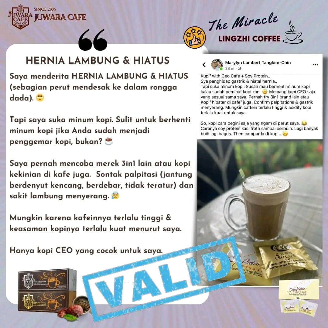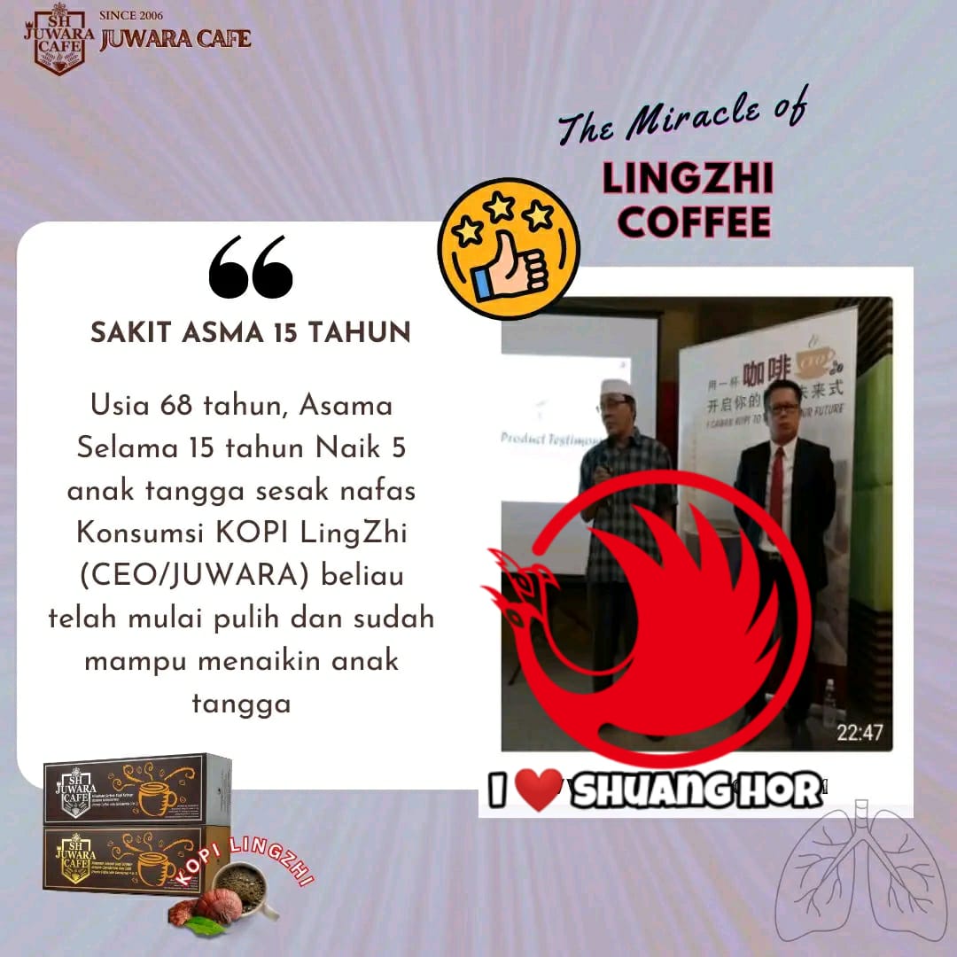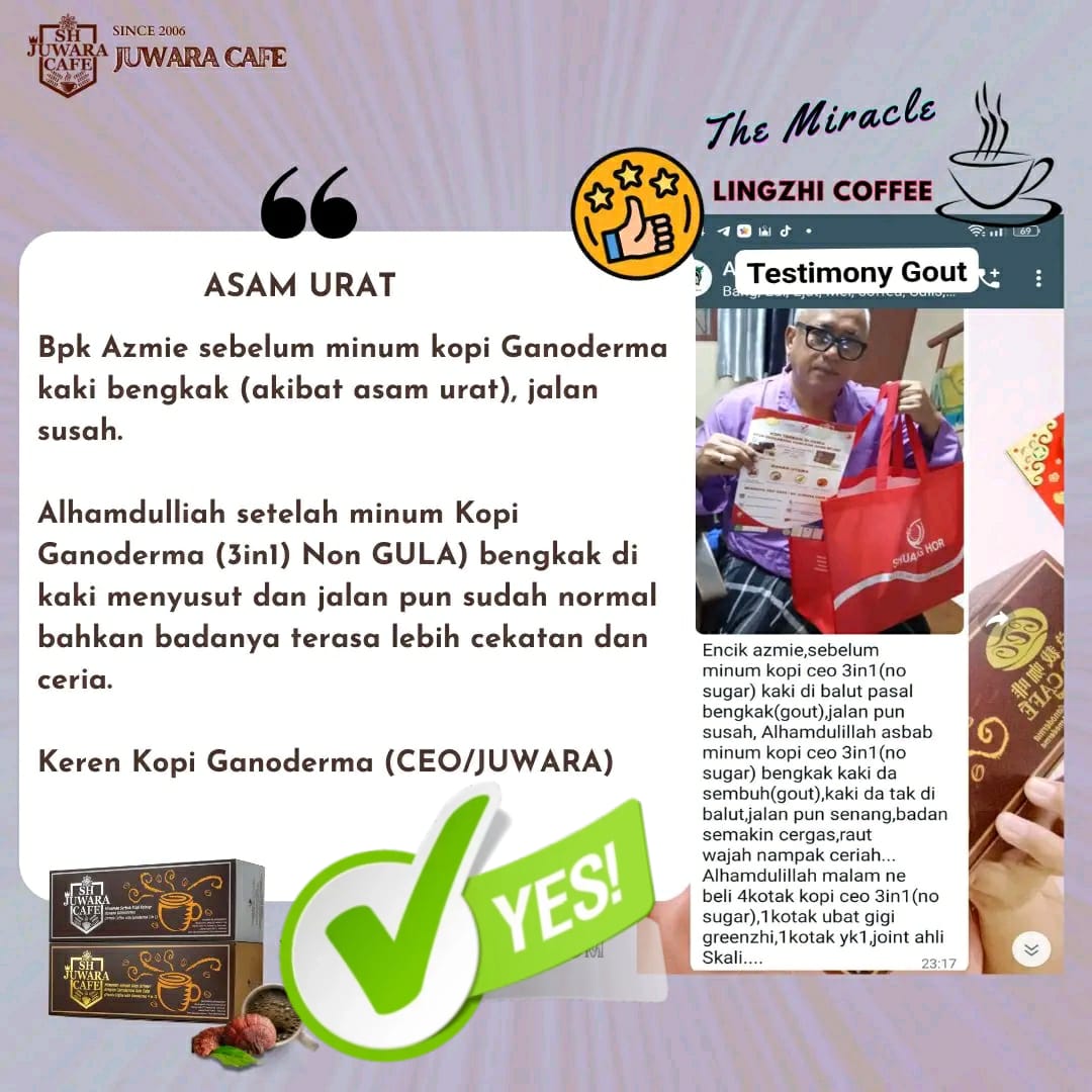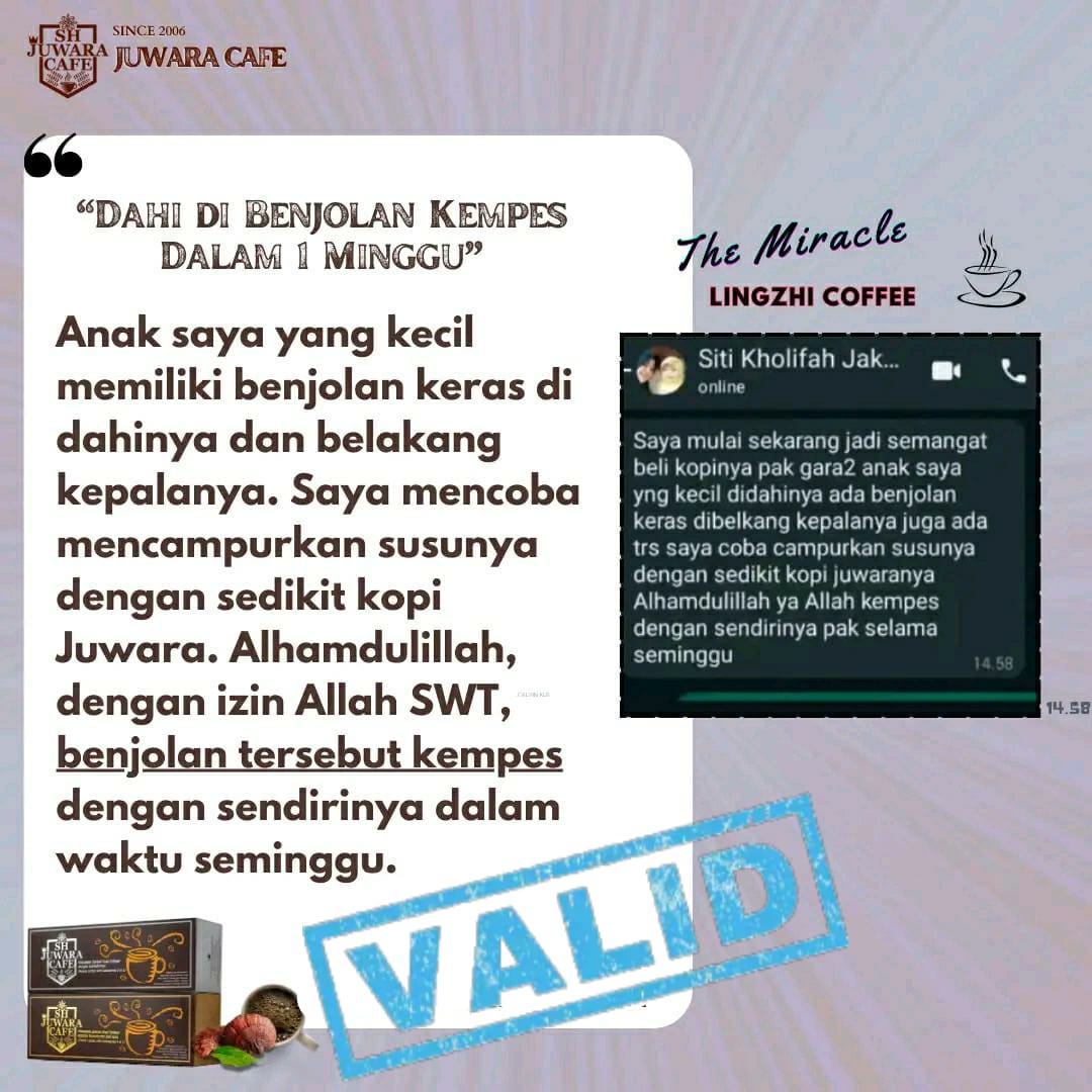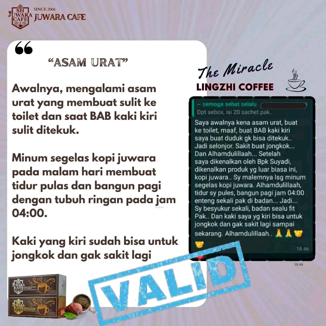 Formulasi Selama 4 Tahun:Proses formulasi selama 4 tahun menegaskan kehati-hatian dalam menggabungkan kopi dengan LingZhi, menunjukkan komitmen terhadap pengembangan produk yang optimal.Mengandung Yungkien LingZhi dari Taiwan: JUWARA Kopi merupakan satu-satunya jenis kopi yang mengandung Yungkien LingZhi dari Taiwan. Ini memberikan nilai terapi yang berpotensi membantu dalam proses penyembuhan berbagai penyakit.Biji Kopi 100% Brazil Arabika & Krimer dari VCO Belanda: Kombinasi biji kopi 100% Arabika dari Brazil dan krimer dari VCO Belanda memberikan citarasa yang lembut dan nikmat sekali. Selain itu, JUWARA Kopi juga bebas dari lemak trans, sehingga aman untuk kesehatan jantung.Dengan JUWARA Kopi, Anda mendapatkan manfaat kesehatan, kenikmatan rasa, dan yang tak kalah penting, harga yang terjangkau.