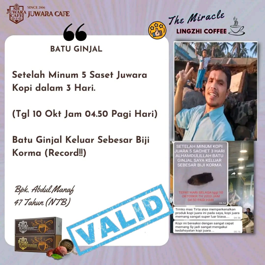 Bukan KOPI Yang dapat merusak ginjal, kerusakan pada ginjal umumnya terkait dengan bahan kimia tambahan yang ada dalam beberapa kopi instan. JUWARA Kopi tidak mengandung bahan kimia tambahan, yang berbeda dengan kopi instan lainnya. Sebaliknya, kandungan LingZhi/Ganoderma dalam JUWARA Kopi TERBUKTI Secara Klinis memiliki manfaat dalam memperbaiki masalah ginjal, seperti membantu menghilangkan batu ginjal dan meningkatkan kelancaran proses buang air kecil.